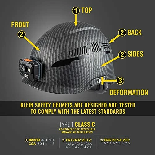 - LARGE ADJUSTABLE VENTS on this Class C Type 1 hard hat meets ANSI Z89.1-2014 (R2019) CSA Z94.1-15 (R2020) EN3972012+A12012-Lateral deformation and molten metal splash clauses