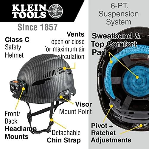and I absolutely love it! It is extremely comfortable, lightweight and the carbon fiber looks bada$$! The detachable light attaches securely, and I have no more worries of the rubber or elastic head bands on expensive headlamps eventually stretching out or dry rotting and breaking. Plus the light itself is amazing, and crazy bright. I had to buy AAA batteries in bulk before, but not anymore. The light rechargeable pretty fast and lasts a good long time on full brightness, so the savings in batteries is an added bonus and should be taken into consideration of the purchase price. I sweat, like seriously… a lot. Like I make my own ponds in the Florida sun and humidity, and the sweat band and suspension pad do an awesome job of keeping the sweat out of my eyes. I added the pack of additional pads at the time of purchase, so I can always start the day with a clean set, and that’s a my recommendation. Also, speaking of temperatures, the adjustable vents on the hard hat work pretty damn well. They let the heat out, provide circulation of air, but also keep heat in on those occasionally cold days to keep you warm. Plus with the Klein name on it, you know it’s quality, and it’s going to last forever. My opinion is that you can’t go wrong with this hard hat, and it was worth every penny.