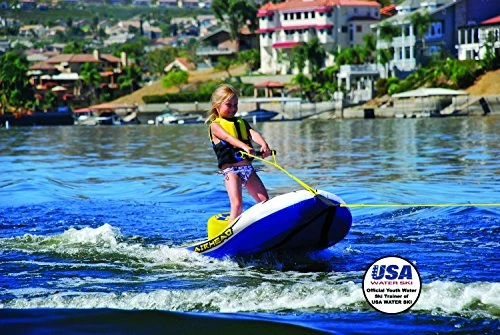 Finally got my 4yo on skis, sorta. Overall we are very happy with this purchase. My daughter is very proud of the fact that she’s a big girl skiing like mom and dad. A few weeks ago we finally got her on a 2 person tube which got her over the fear of being towed behind the boat. The next week we finally talked her into riding her ski after my godson who is 6 took it out and loved it. My suggestion to those purchasing this for your child is to follow the same progression as us.The best thing about the ez ski trainer is the seat. When my daughter gets a little off balance or hits some rough water she just sits down. This has given her a lot of confidence thus far. The next best thing is the dual handles so that if she falls the person holding the handle in the boat just let’s go so you never have to worry about them trying to hang on and getting dragged.The only thing I was disappointed in is the lack of control the skier or rider has. The kids can make it go back and forth a bit but not much. This is due to two factors I think. First the ripe is attached to the ski so it’s very hard to point it any direction except at the back of the boat. Second it’s a tube so what can you expect. I think I may try removing the rope from its attachment point on the tube at some point to see if this will give them more steering ability and help them get used to the pull of the boat.