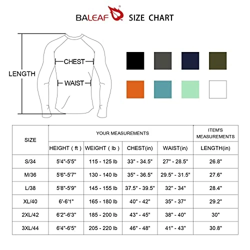 I love these shirts. I wear them all summer. In the pool, at the beach, fishing, in the yard. It’s 80-90 degrees here in the summer. They look sharp enough to wear anywhere. I ordered two about 2 years ago and I just ordered more. I don’t like to get a lot of sun and I’ve never been burned in these. I also like the way they feel in the water, if the water is a little chilly I feel warmer. If its hot out, a wet shirt keeps me cool even though it dries fairly fast. I had never heard of Baleaf until I ordered these but the price is right. Well known brand names sell for $10-$20 more and I can’t imagine they are much better. I am happy to get 2 seasons out of these. They do start to stretch after a lot of use and wear, but I have not seen much fading or any rips/tears. Full disclosure, mine get heavy daily use in a chlorinated pool. I think that does a number on them. I rarely wash them and I air dry them. With occasional use these would last several years. I am 5’10 200 and I like the XL. If you look at the size chart, it does say to get an XL with my waist size so I would go by that. I normally wear a Large in other clothes so these are a tight fit. I could probably fit in a L but I’m looking for a looser comfortable fit and I think the sleeves would be too short. I don’t usually write reviews but I am now because I hope this company keeps cranking out great clothing.