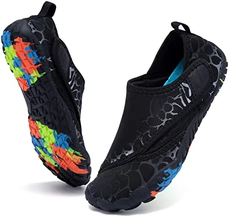 - FOOT SAFETY: The rubber soles, with a really comfortable and thick foam arch-support insert inside of them, are flexible yet thick enough to protect your feet from stepping on rock and stone. Breathable and smooth fabrics with fine stretch on uppers, flexible and comfortable. Smooth designed neck prevents chafing when wearing our water shoes.