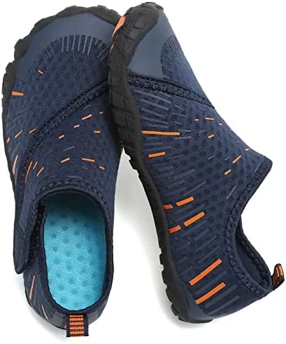 I ordered two pairs of these shoes for my son last year, and I’ve ordered two pairs this summer as well. My son is currently wearing a size 2.5-3 in Plae shoes but he’s able to wear a size 3 in these without them slipping off but with plenty of room to grow into. This part of the review refers to the navy and orange style (See update#2 below for specifics on the blue with glow in the dark sole):The good is that they are stylish, comfortable and easy to put on for kids with wide feet. They are lightweight enough for my son to wear in the pool, but also have enough traction on the bottom for playing in the splash pad and climbing on water slides at camp. They work well for the beach too, but the sand is hard to clean out.The bad is that first pair I bought last year got fuzzy from putting them in the dryer. I’d need to dry them, because my son’s wet swim stuff would come home from camp and need to be washed and dried for the next day and air-drying wasn’t always quick enough. So this year, I plan to buy two pairs to rotate.Update #1 (7/1/2021): The navy and orange water shoes are holding up pretty well this summer. They are still the easiest to get on/off that I’ve found. My son has gotten more than 10 uses out of them so far, and they are still in good condition. There is still a small amount of fuzz with air-drying, but it blends in on the navy color and can be carefully trimmed off. See the picture, and note that it is a closeup so it’s less noticeable in person. I bought another major brand of water shoe, which cost a bit more, and those also have some wear after similar usage.Update #2 (7/1/2021): I guess I can’t write multiple reviews for the same product listing, but I ended up buying a slightly different style from the same listing as my alternate pair for this summer. The blue with glow in the dark soles caught my eye, and I have to say that I love these and highly recommend them.I kinda debated between whether they were cool or a bit cheesy, but my son loves space and I think they are a fun style for a kid. He’s not up much past dark, so I doubt we will get much use out of the glow in the dark but I also like the green color of the soles. And, they do faintly glow in a very dark room! More along the lines of glow in the dark clothing than the stylized listing photos.They are still very easy to put on and take off, but not quite as easy as the navy and orange style. So far after 5 plus uses the material looks perfect, and it’s even a little bit softer than the other style. I’ll update if there are any changes, but I think these might be the best water shoes I’ve found. And, I have tried quite a few different brands and types of water shoes for my son.