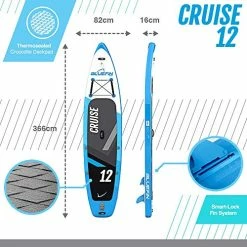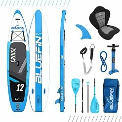 - 12′ – LOOKING FOR THE MOST STABLE, VERSATILE, ALL-INCLUSIVE SUP PACKAGE ON THE MARKET? Only Bluefin uses 1000 Denier Exo Surface Laminate PVC & Pro Weave Drop Stitch. These materials make our boards so tough they are can hold up to 28 PSI and are the most stable rigid, stable inflatable SUP you’ll ever buy. Cruise 12’ is perfect for taller paddlers or for taking seated company: 366 cm x 77 cm x 15 cm