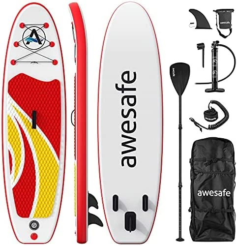 - awesafe inflatable stand up paddle board provide you everything you need to paddle boarding trip: Foldable & inflatable paddle board, detachable fin, adjustable premium alloy paddle, safety leash, manual air pump, waterproof bag for essentials (such as cellphone, keys, and wallet), comfortable backpack which can storage the board and all of its accessories.