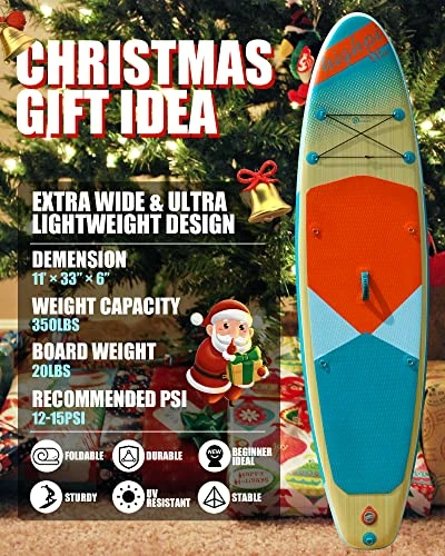 - γWOOD GRAIN Extra Wide Stable Designγ11’long x 33” wide x 6” thick, with weight capacity up to 350lbs.The extra wide SUP design is easy for beginners to stand up and keep balance. It is an ideal board for all skill levels with pets.