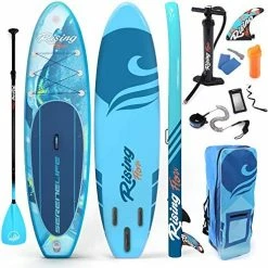 - ALL-IN-1 BLOW UP PADDLE BOARD KIT: Complete with must-have paddle board accessories, our SUP paddle board will have you ready to hit the waves. Includes 10′ board, coiled ankle cuff safety leash, Upgraded Aluminum paddle, manual air pump & storage bag.