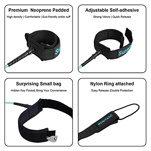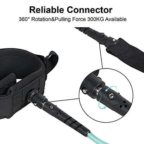 - ?MORE DURABLE AND SAFE: Paddle board ankle strap with precision molded-in double stainless steel swivels to prevent tangling, connection hardware made of durable marine-grade stainless steel, which can be able to resist the sea water corrosion for a very long time. You don’t need to change the sup leash paddleboard frequently