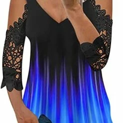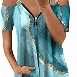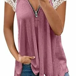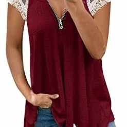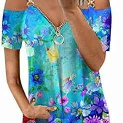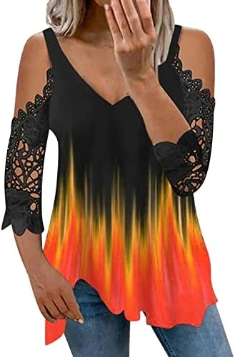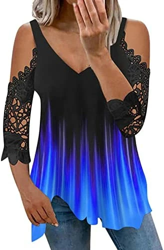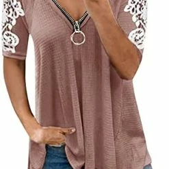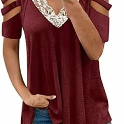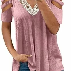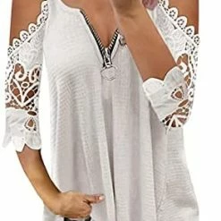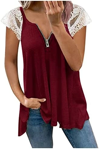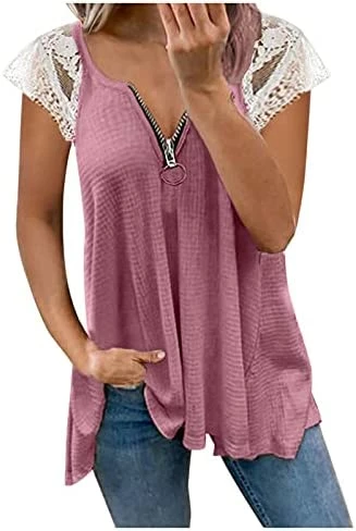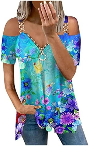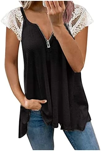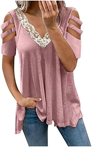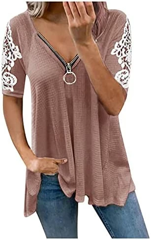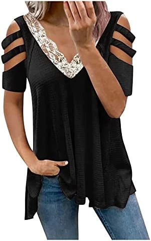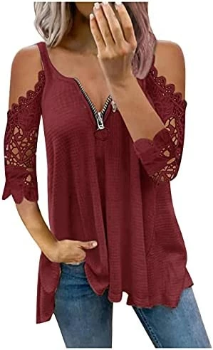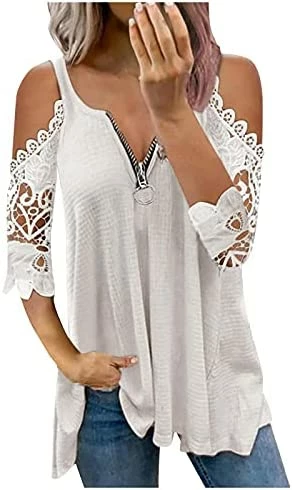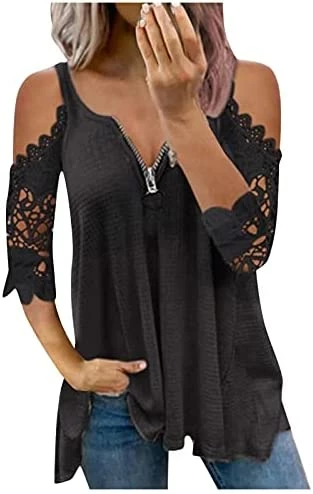 Flash Sale 👍 Off Shoulder Tops For 👩 Women Zipper V-Neck Lace Hollow Tunic T-Shirts Plus Size ☀️ Summer Strappy Tee 👚 Shirts Flowy Blouses Gxfc-s121-multicolor 🔔