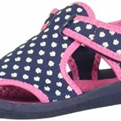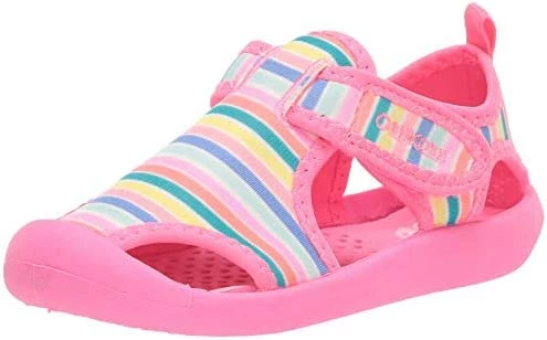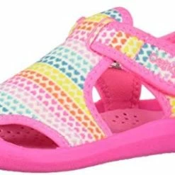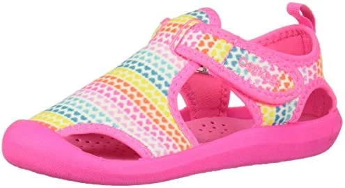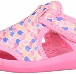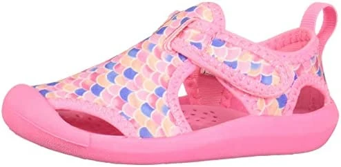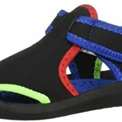 Update: itโs been a few weeks of fishing/river use with multiple washes and scrubs with no avail. They look raggedy and seem to have stretched out slightly; My toddler hasnโt noticed, and they still fit fine. The Velcroโs straps just need to be adjusted tighter. Overall the bright rainbow colored shoe should probably only be used in nice clean pools/water parks since the dirt really stains the shoe. A darker color would have been a better purchase for our summer activities, but the bright colors were cute (for a week… eye roll). Rating is now 3 stars because the material is impossible to clean once soiled The Easy for my 3 year old to put on and the soles are really supportive and non-slip. My toddler loves them! I bought them so she can wear them when we fish and walk around on mossy rocks. The colors are perfect. Not too bright and neon but not pastel either. So they match with a lot of her clothes! The opening on the toes arenโt big enough for her toes to fall out, but just enough to catch a little air and feel like sandals.