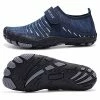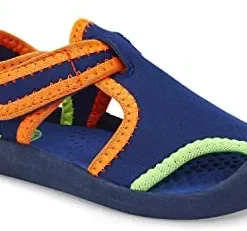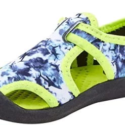 I have ordered 3 pairs of these now – one pair each summer for my kid, as his foot has grown, and these water shoes are fantastic. Not slippery on the bottom, runs true to size, holds up well in the washing machine. I wash them after each time he wears them. They offer good protection from rocks and sticks in the yard when he plays in the sprinkler. Also good protection from hot sand or shells at the beach. Easy on and off, even when wet. No rubbing, no blisters. The material is like a thick neoprene upper, and the soles are rubber for protection.I thought this color was navy tie dye, but there are actually tiny sharks in the pattern too. 4 year loves that, of courseGreat shoe – buy them!!