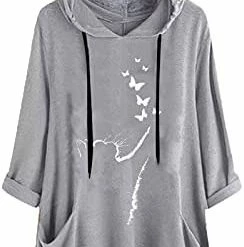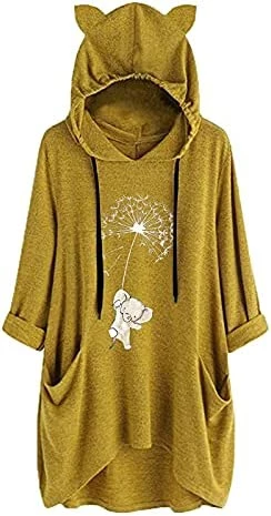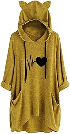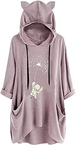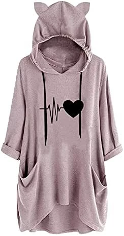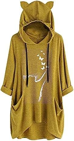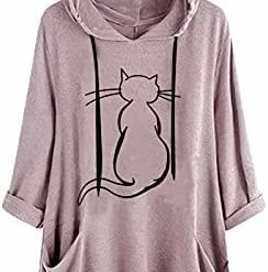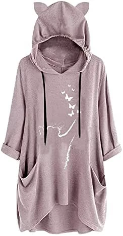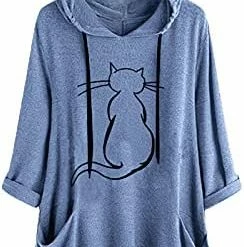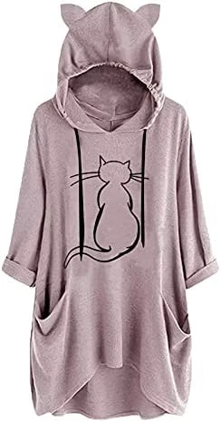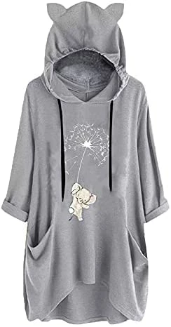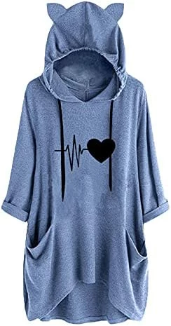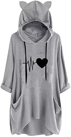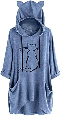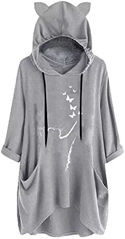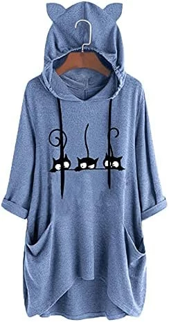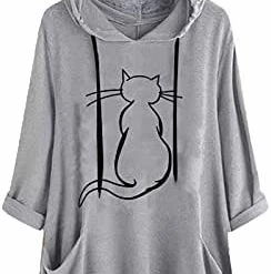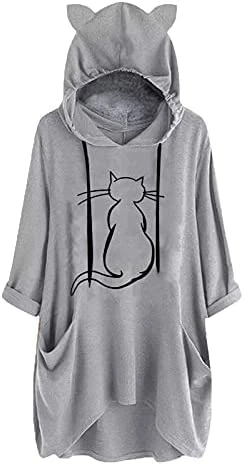 Buy 💯 Womens Cute Cat Ear Hoodies Novelty Printed Pullover Sweatshirt With Pocket Loose 3/4 Sleeve Hooded 👕 Shirt Tunic Blouse 12 – J1 Gray 👏